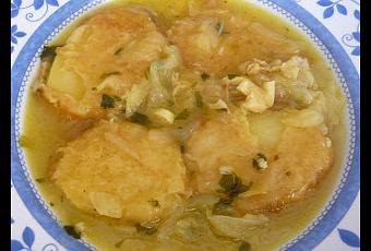 - En una olla baja sofreímos la cebolla cortada en juliana y el ajo picado. Cuando esté dorado añadimos una cucharada sopera de harina de trigo y removemos un poco. Añadimos 1 litro y 1/2 de agua y dejamos que rompa a hervir.