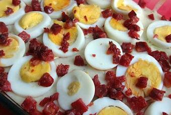- En una fuente de horno echar una capa de salsa de tomate o tomate frito. Encima colocar las patatas bien escurridas, y encima, una capa de bechamel. Adornar con trocitos de chorizo y rodajas de huevo cocido.