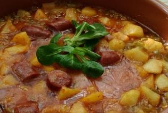 Pelamos y cascamos las patatas, reservamos picamos la cebolla y el pimiento verde. Sofreímos añadimos las patatas, los pimientos ahumados y cubrimos de agua al principio a Fuego fuerte y una vez levando el hervor a fuego lento 10 minutos antes de terminar la Cocción de las patatas, añadimos el chorizo atrocitos más o menos gorditos, cogeremos con La espátula los pimientos y junto con un tomate pelado los pasaremos por el túrmix y Añadimos la salsa y rectificamos de sal.