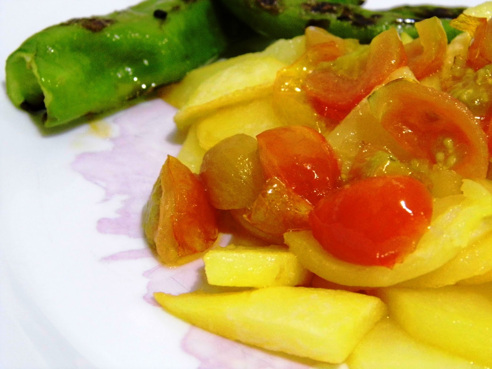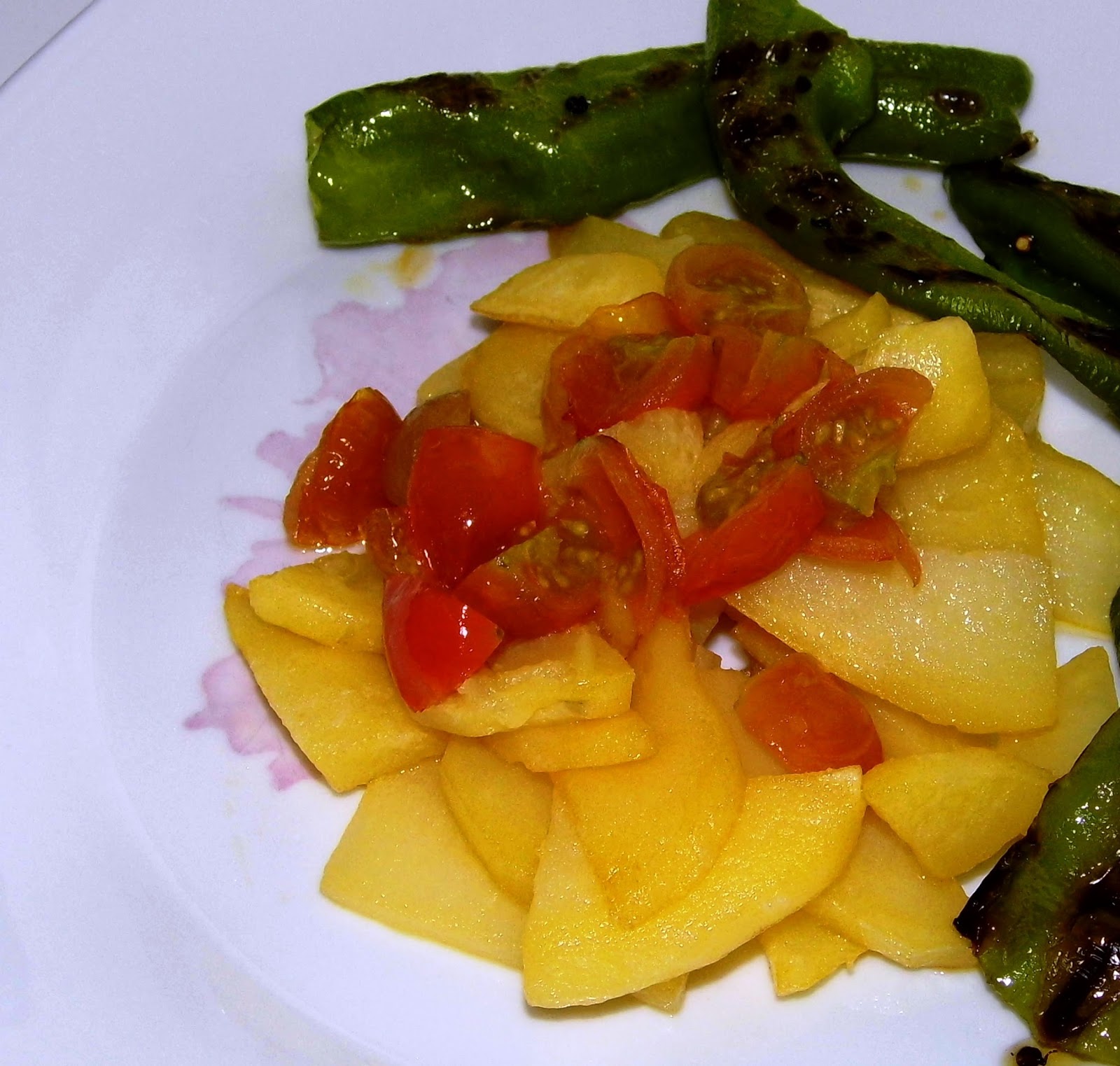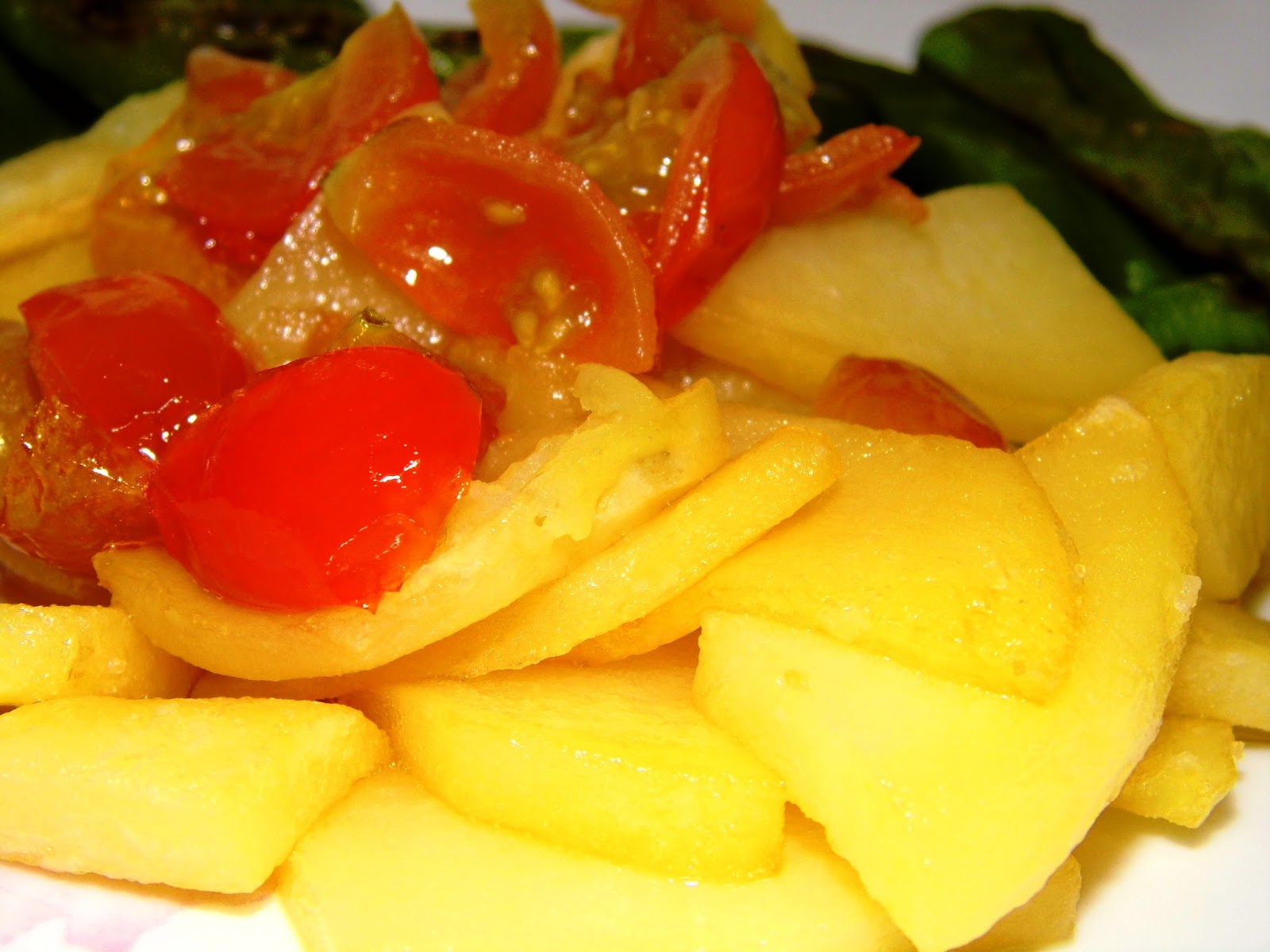 2 patatas2 dientes de ajoTomates, cherrys en mi casoaceite y salPara acompañar asé unos pimientos verdes.En una sartén con abundante aceite freimos las patatas cortadas en rodajas finas con el ajo también laminado.Cuando estén casi doradas las sacamos a un papel absorbente y en el mismo aceite freimos el tomate, yo lo puse sin picar, solo partido por la mitad, freimos unos segundos y añadimos de nuevo las patatas.