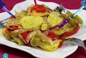 1- Calentar el aceite en menú freír 180º-200º, 15 minutos, hasta que descuente tiempo. Añadir la cebolla cortada en pluma, patatas en rodajas panaderas no muy finas, los pimientos en tiras no trozos a gustos, los ajos en láminas y 1 cta. sal, pochar hasta que termine el tiempo, removiendo de vez en cuando.