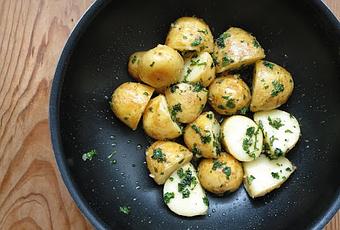 Ingredientes: 500 g patatas pequeñas; 2 dientes ajo; perejil fresco; aceite; sal; vino blanco.