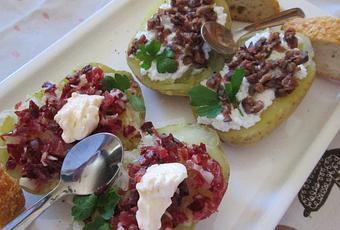 - Patatas asadas de mediano tamaño, blancas (las rojas necesitan más horno) 2.- Requesón.- Anchoas picaditas.- Chucrut.- Jamón ibérico picadito.- Sal.