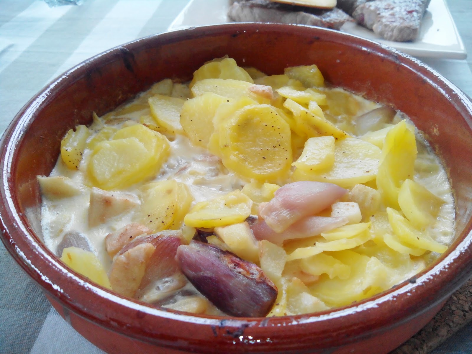 Hoy os subo la receta de unas ricas patatas para hacer de acompañamiento. Las patatas se hacen primero en el microondas con unas chalotas y un poco de mantequilla. Después se riegan con leche evaporada, se trocea una pera en ellas y se pasan al horno. De esta manera, las peras irán soltando su jugo en la salsa, dejando en ella su sabor.Otra forma de la que pueden quedar bien es diluyendo un poco de queso mascarpone en la leche, que seguro que conjuga muy bien con la pera. Y según el plato que vayas a acompañar, le pueden ir también unas nueces troceadas.