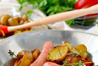 - Take the pan out of the oven and place the vegetables and the sausages in the same pan. Stir all the ingredients so they get well-mixed and bake for another 20 minutes more. Vegetables should be a bit tender and the potatoes should be golden brown.