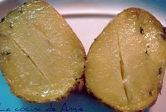 Hoy más que un plato, os traigo unas patatas de guarnición para otros platos, pero si os gusta este queso, os aseguro que están muy buenas. Podéis hacerlas con otro queso azul, que no sea tan fuerte como el roquefort. Como siempre: a vuesto gusto!- Abrir las patatas por la mitad y envolver con papel film; meter 5 minutos al microondas. Untarlas con queso roquefort, haciendo unos incisiones en cada mitad, para que penetre el queso ligeramente, volver a envolver y dejar otros 5´ (aprox., según tamaño).
