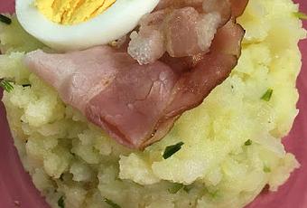 Se emplata poniendo las patatas en un aro, con la loncha de bacon encima y el huevo duro en rodajas. Se come inmediatamente.