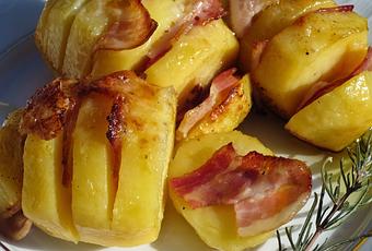 Ayudaros con el filo de un cuchillo, e introducir un trocito de bacon en cada raja,salpimentar y queso rallado o trozos en lonchas, poner una ramillita de romero , si os gusta ese saborín.