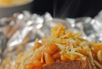 Retiramos las patatas del horno, las cortamos por la mitad (o haciendo una cruz en la parte superior, como hacen en el Reino Unido), les añadimos un poco de mantequilla y, sobre esta, queso rallado, judías en salsa de tomate, salsa boloñesa o cualquier cosa que se os antoje.