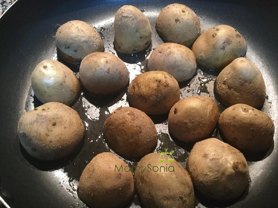 Ponemos un pelin deaceite en el fondo de una sartén y ponemos boca abajo las patatas, cuando estén doraditas les damos la vuelta.