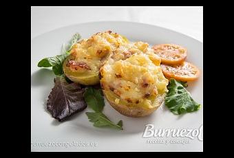 Hoy hemos preparado unas sabrosas patatas rellenas con cebolla, bacón, parmesano, patata y mascarpone, un delicioso bocado que gusta a casi todos.