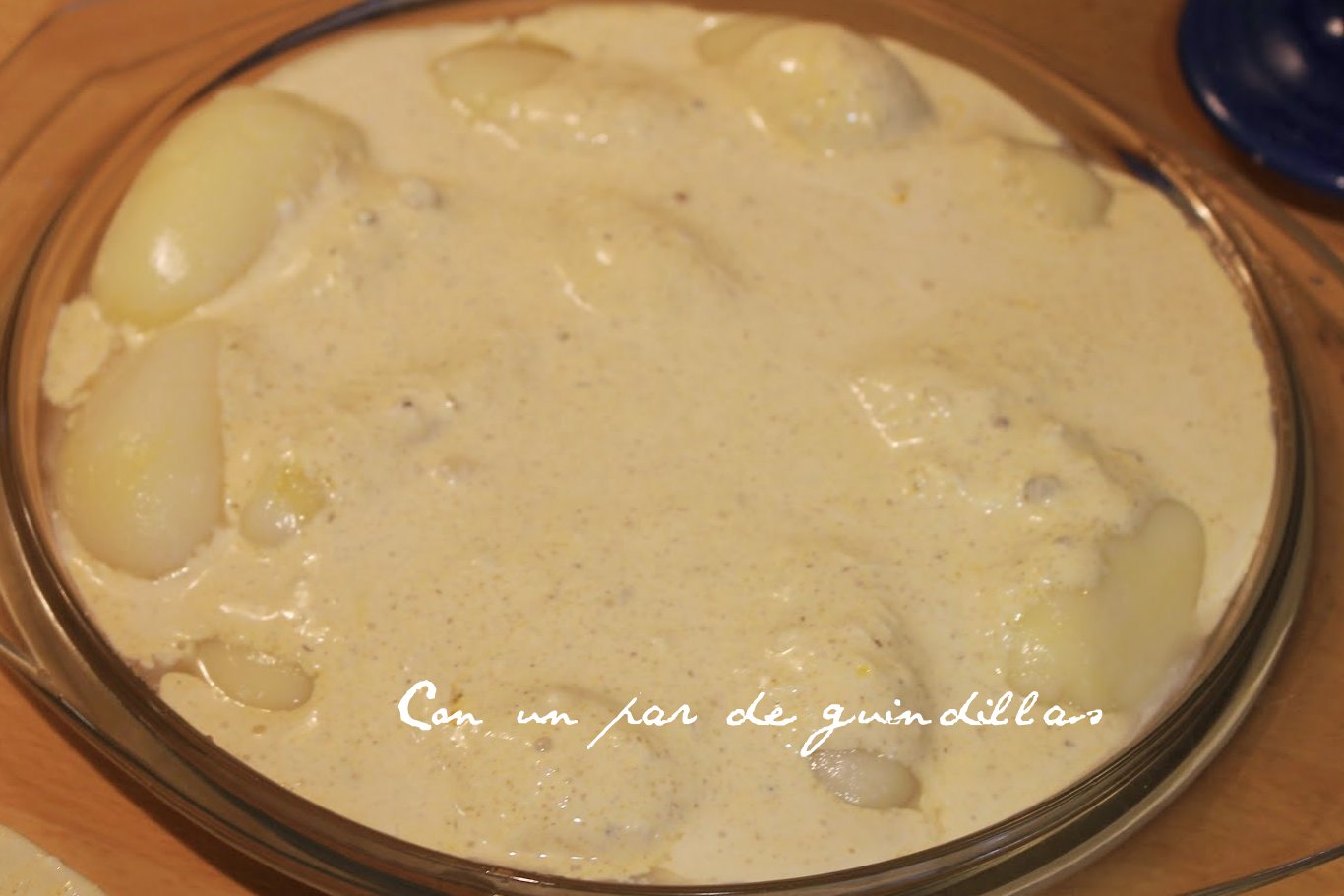 4.- Bato la nata con el yogur y el coco,, lo mezclo con las especias y rocío con esto las patatas, procurando que queden totalmente cubiertas.