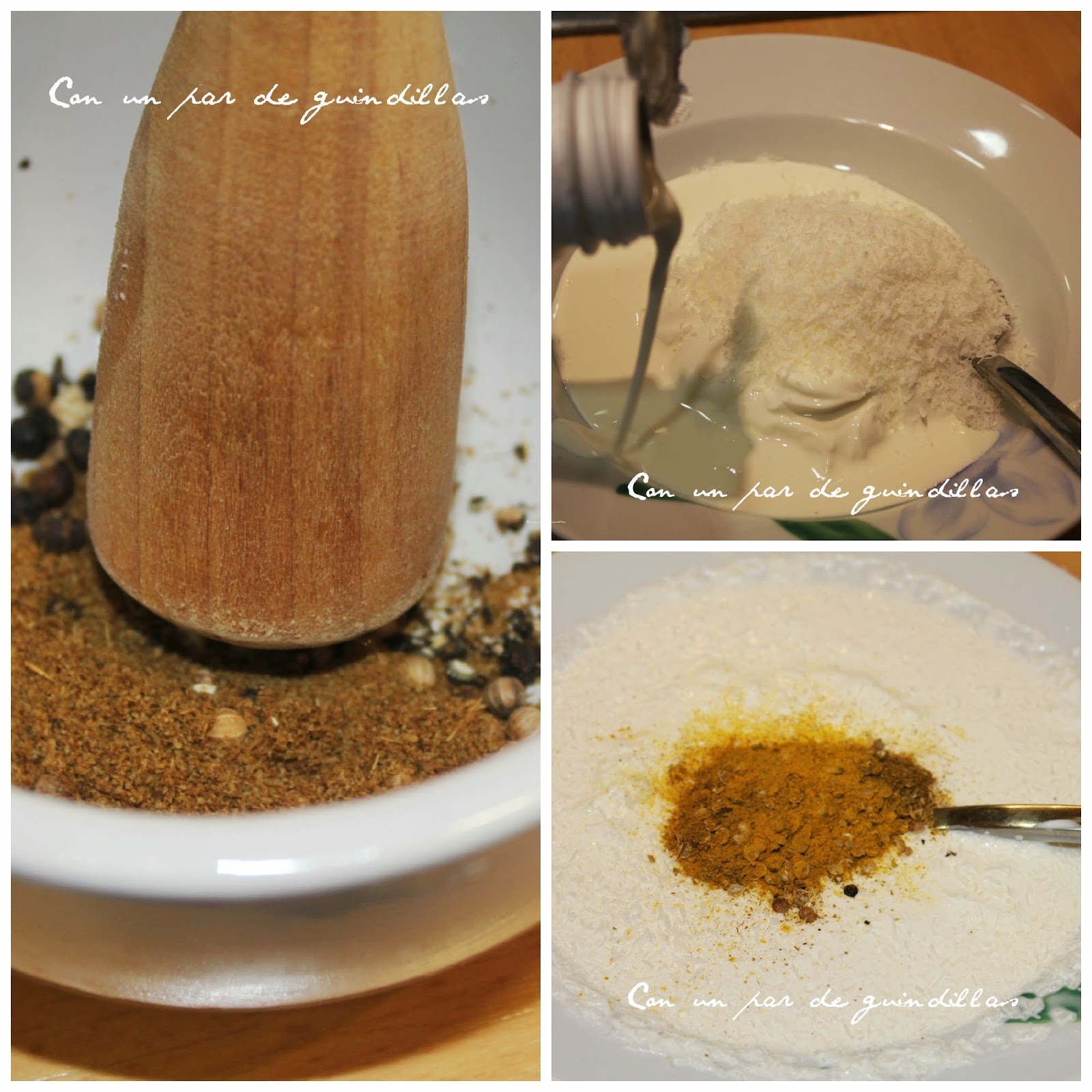 2.- Trituro las semillas de cilantro con la pimienta y el comino en un mortero. 3.- Añado sal, el aceite y el vinagre. Pongo ahora la cúrcuma y lo mezclo todo bien.