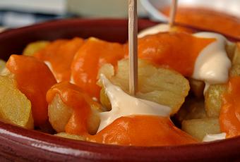 Para servir en un bol ponemos las patatas, después mahonesa y bañamos con la salsa brava. Listo y bien bueno