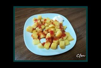 Y ya están listas para emplatar..Las sazonamos y cubrimos de salsa brava...En mi casa les gustan con un poco de mahonesa, por eso suelo añadirla en una esquina...