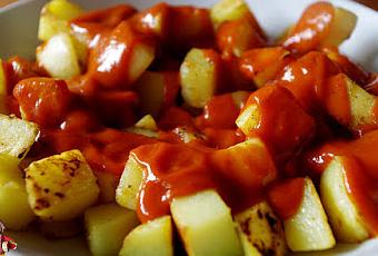Ingredientes: 4 patatas medianas; 1 cucharadita guindilla molida; curry; sal; pimienta; aceite; salsa brava.