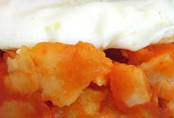 El restaurante "Casa Esteban" es un auténtico museo gastronómico y taurino, con una decoración muy peculiar, a base de antiguedades, aperos de labranza, cabezas de toro, rifles, pero sobre todo destaca por sus exquisitas especialidades en cocina tradicional. Una de ellas es este plato de "papas con tomate y huevo" que me he permitido el lujo de versionar.