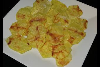 Elaboración:Colocamos un papel para horno en la bandeja del microondas, cortarlo redondo y de la misma medida. Ahora con una mandolina o con un cuchillo cortamos las patatas muy finas, las colocamos encima de la bandeja del microondas y las ponemos durante cinco minutos a 700 watios, pasado ese tiempo abrimos la puerta vemos como van y las dejamos cuatro o cinco minutos más a la misma temperatura hasta que veamos que están doradas.