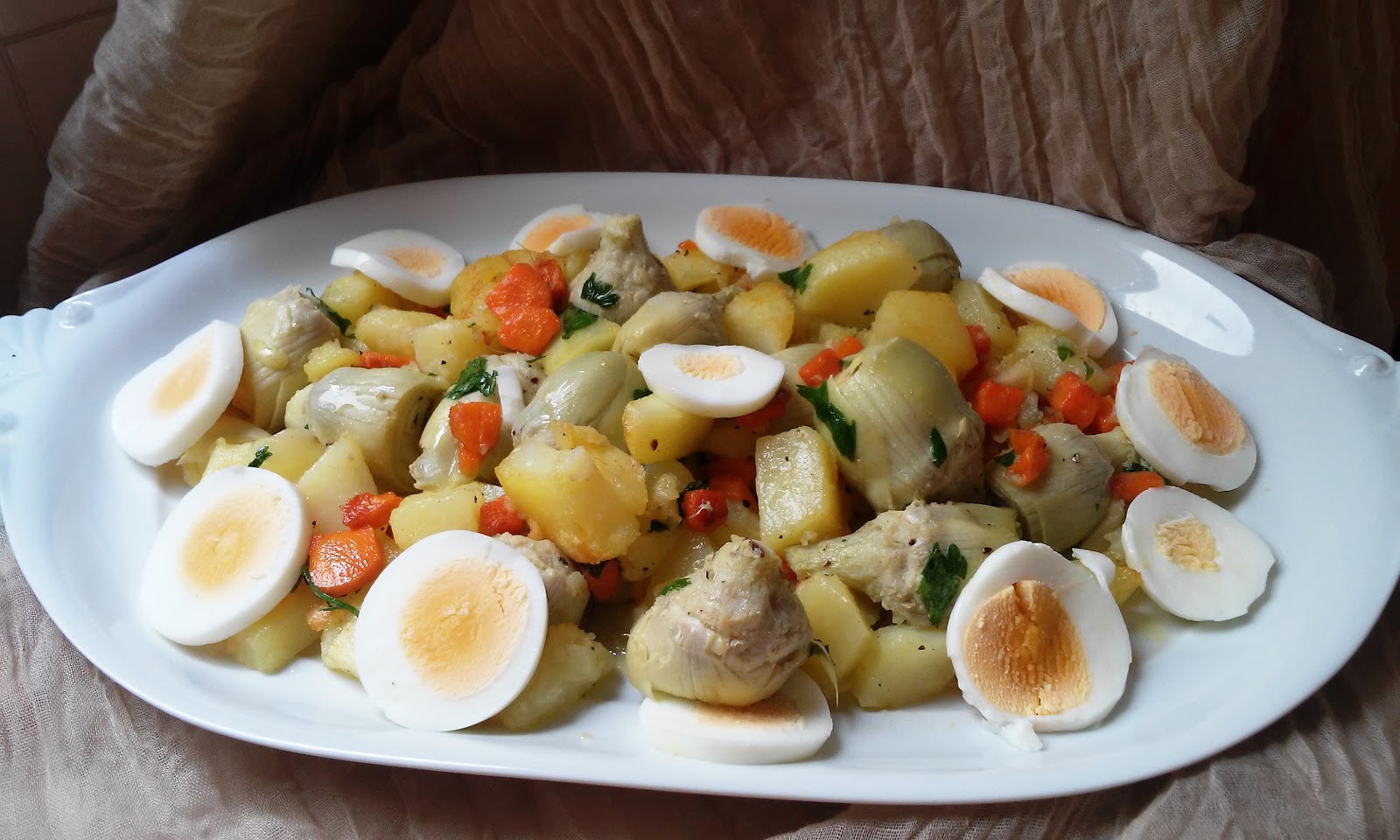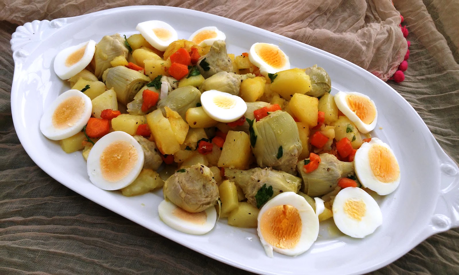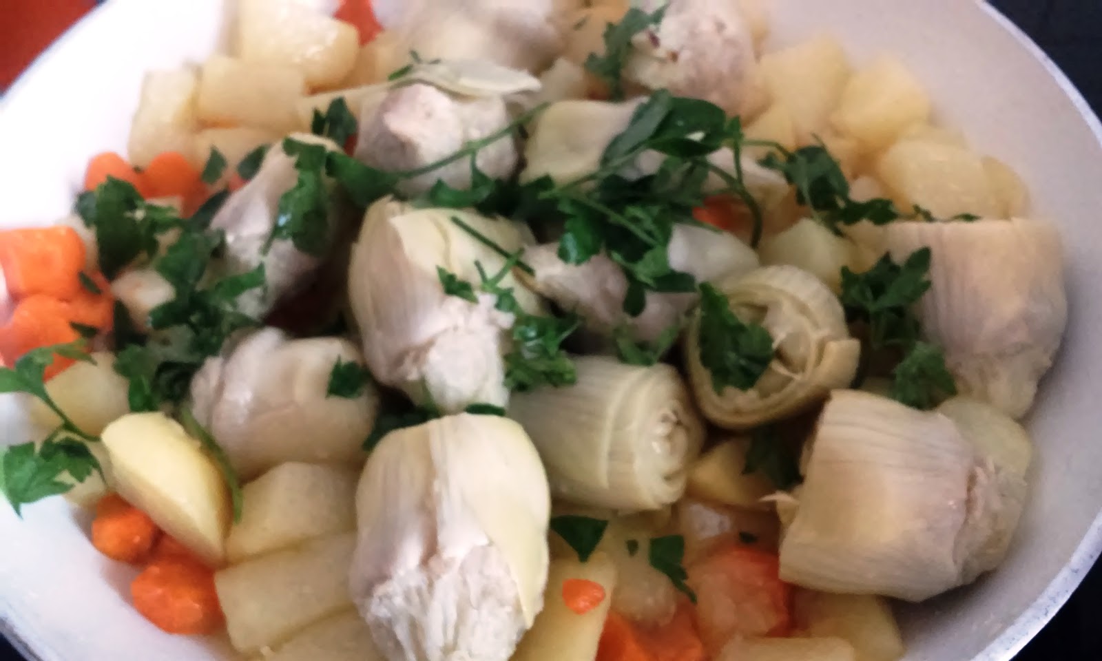 3 patatas medianas2 zanahorias1 lata de alcachofas perejil frescosal y pimientaaceite de oliva2 huevos duros3 dientes de ajo