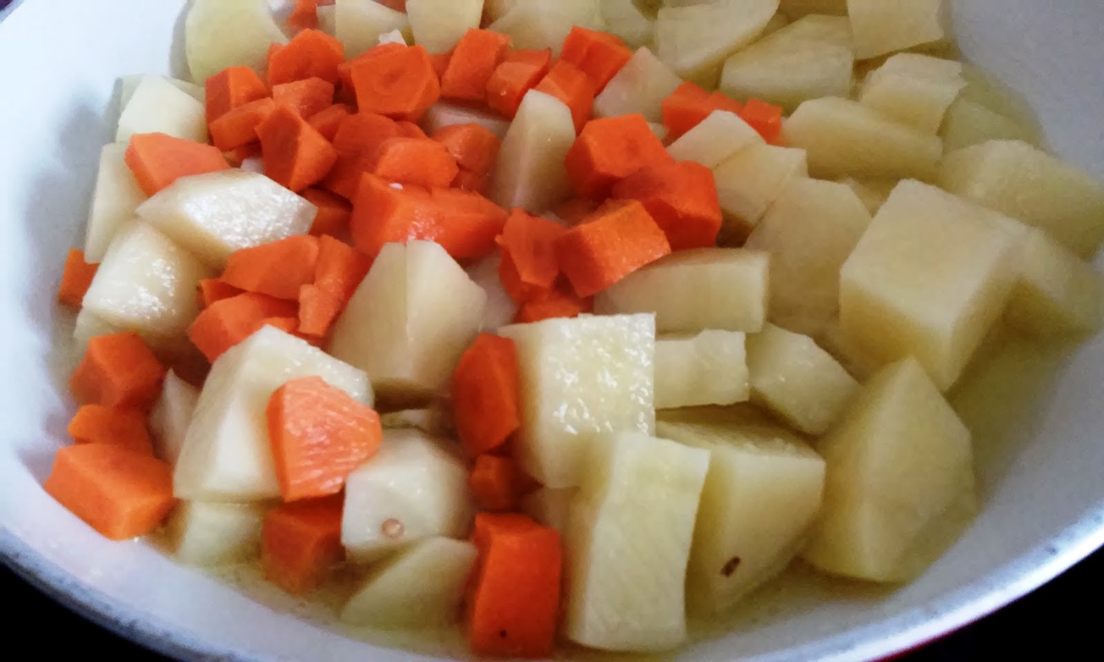 Pela y corta las patatas en dados, pela las zanahorias y corta en rodajas. Lávalas, escurre y ponles sal. Pela y corta en láminas los dientes de ajo.Pon aceite a calentar en el fondo de una sartén y dora los dientes de ajo, las patatas y zanahorias.