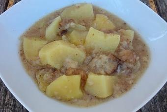 En la misma cazuela rehogamos las patatas, las pasamos a la Crock-Pot, añadimos el majado y cubrimos las patatas con agua. Salpimentamos y cocinamos 4 horas en temperatura alta.