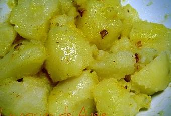 Este plato típico de la Rioja, es de mi amiga Paula (Con las zarpas en la masa). Es sencillo y delicioso. No hagáis caso de la foto y probarlo, está riquísimo. Gracias, Paula, y un besazo!- Para dos personas: Pelar 2 patatas grandes, trocearlas y hervir en agua con sal y un chorrito de aceite durante 10´. Escurrir.