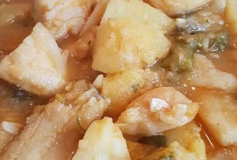 Añadimos las patatas cortadas en trozos (mejor desgajar las patatas para que suelten almidón y el guiso quede ligado), colamos el caldo, lo añadimos a la cazuela y dejamos cocer hasta que las patatas estén tiernas, añadimos el bacalao y el majado que teníamos reservado, cocemos todo junto cinco minutos más, servimos inmediatamente.