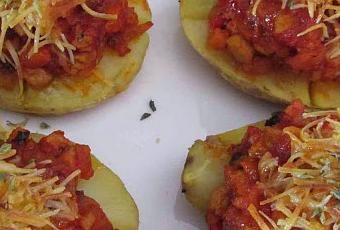 Cortamos las patatas al medio y a lo largo y trazamos con un cuchillo en cada media, una cruz, abriéndolas un poco. Distribuimos la boloñesa y les ponemos queso por encima.