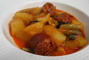 INGREDIENTES PARA 2 PERSONAS500 gramosde patatas.2 chorizos asturianos tiernos.1 cebolla mediana.1 tomate de pera maduro.Un manojo de Acelgas frescas.1 hoja de laurel.3 dientes de ajo.Aceite de Oliva Virgen Extra.Sal.