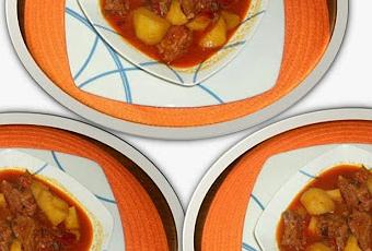 Terminamos por añadir agua y dejar cocer para que las costillas de cuezan unos 15 minutos y cuando estén casi cocidas las costillas añadimos patatas peladas y chascadas en cachelos para que suelten fécula al cocerse y espese un poco el caldo.