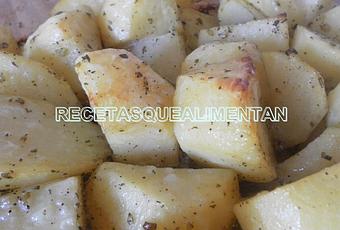 Ahora, ponemos las patatas en una fuente de horno y horneamos a 180º C durante 35 minutos aproximadamente. Removemos las patatas pasados los primeros 10 minutos de horneado.