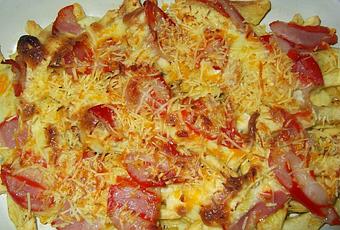 Ingredientes:- 5 patatas medianas.- 4 lonchas de magreta, bacon o panceta.- 80 gramos de queso rallado.- Aceite de oliva virgen extra.- Sal.o Salsa de cebolla.§ 200 gramos de aceite de girasol.§ 1 huevo.§ Medio limón.§ 20 gramos de cebolla.§ Una cucharada pequeña de orégano.§ Sal.