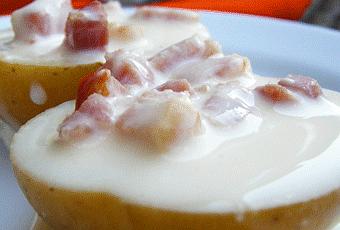 Freímos el beicon en una sartén a fuego medio-alto hasta que esté crujiente y se lo añadimos a la crema de queso. Cortamos las patatas por la mitad, a lo largo, las rociamos con la salsa de queso, beicon y cerveza y servimos inmediatamente.