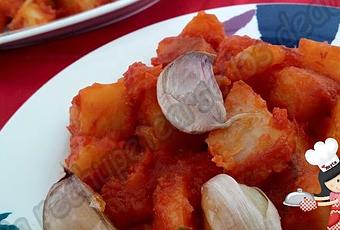 - En una sartén, echar aceite y freir las patatas con los dientes de ajos, a fuego lento. Al ser los trocitos de patatas un poco gruesos, así se cocinan mejor y quedan melositas.- Cuando ya casi estén listas las patatas, poner el fuego más fuerte, para que se doren un poquito.- Escurrir todo el aceite y echar el tomate frito sobre las patatas fritas. Remover un poco para que tome calor el tomate y ya está listo.