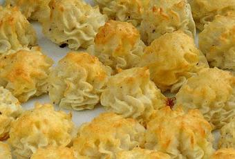 Un acompañamiento muy sencillo y vistoso. Quedan crujientes por fuera y tiernos por dentro.- Preparar un puré de patatas espeso y añadir una yema de huevo, sal, pimienta y 1 cuch. de mantequilla derretida.