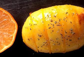 Unas patatas al horno en salsa de naranja y miel. Ideales para acompañar pescado, carnes o verduras a la plancha, o para comerlas solas.