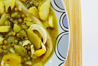 Añadimos el caldo de verdura sin gluten hasta cubrir bien las patatas. Lo dejamos cociendo a fuego medio tapado durante 25-30 minutos aproximadamente.
