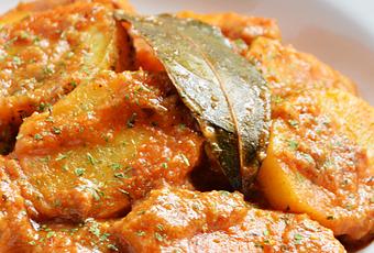 Cortar las patatas en rodajas gruesas. Freírlas hasta que tomen color. Reservar.