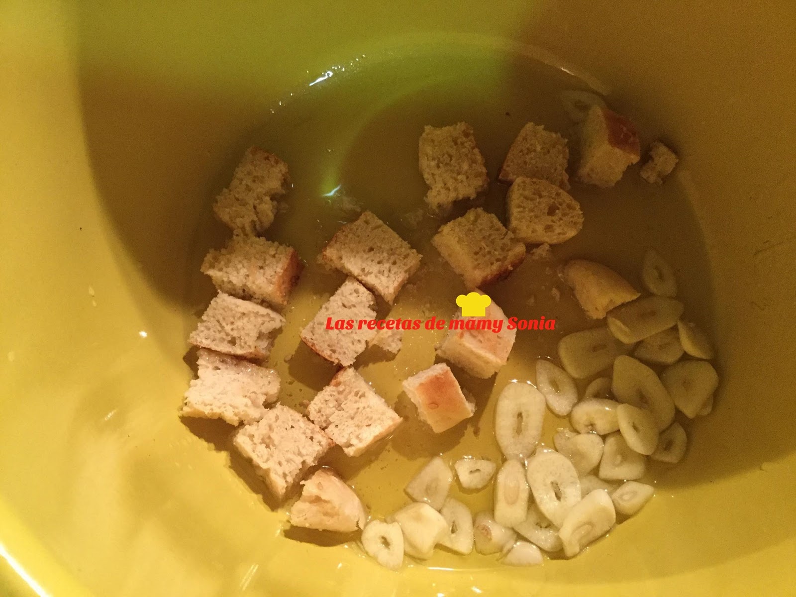Hacemos la salsa: Sofreímos los ajos en láminas y el pan en taquitos hasta que tome color. Añadimos el pimentón con la sartén fuera del fuego, para que no se nos queme. Ponemos el sofrito en un vaso de batidora.