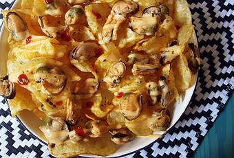 En una bandeja ponemos patatas y distribuimos los mejillones, metemos la mayonesa de escabeche en un biberón y rociamos, agregamos un poco de picante al gusto y espolvoreamos orégano. Listo para comer. No esperar mucho para que las patatas no pierdan el crujiente.