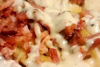 Patatas o patatas precocinadas (de las que metemos al horno)salsa de yogurqueso rallado de gratinar 4 quesosbacon en taquitos