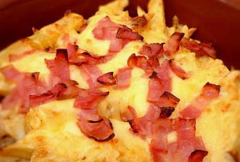 Repartimos por encima el queso rallado y a continuación el bacon picadito. Lo llevamos al horno precalentado a 180°C unos 15 minutos y listo!