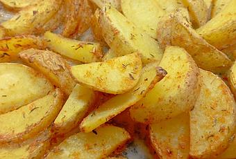 - Lavamos las patatas y las cortamos en gajos no muy gruesos para que puedan hornearse más fácilmente.