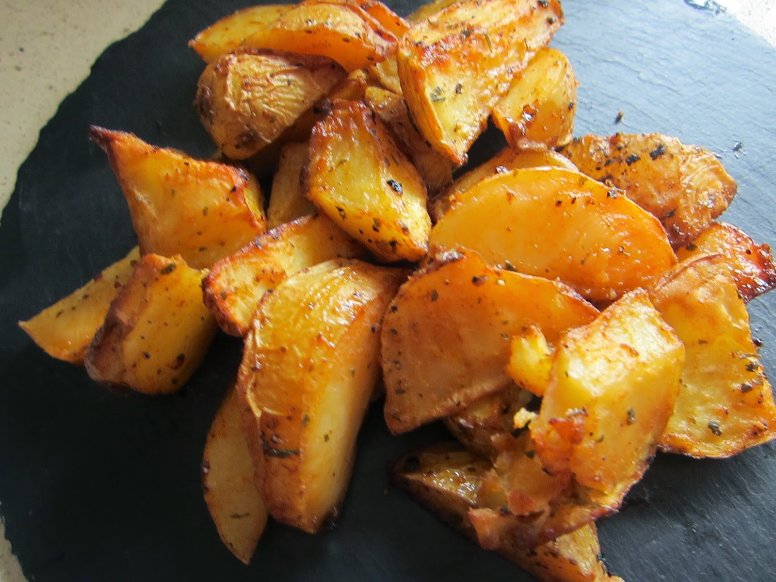 PREPARACIÓN:Lavamos bien las patatas porque las vamos a comer con piel, las cortamos en gajos y ponemos en un bol.Echamos un buen chorro de aceite y removemos para que se impregnen todas.Añadimos el pimentón, la sal, el perejil y unas gotas de Tabasco ( a gusto y depende si hay niños o no echaremos más, menos o nada...)Hay que remover bien, para que queden todas las patatas impregnadas de las especias y el aceite.