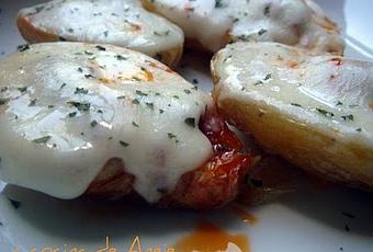 Otra receta facilísima y deliciosa, copiada a Yolanda (Diario de una dieta). Supongo que la conocéis, si no, pasad por su blog, es encantadora! Gracias por tan rica receta!- Asar las patatas durante 8´ en el microondas (enteras, lavadas, pinchadas, con un chorrito de aceite y envueltas en papel de cocina). Abrir por la mitad, cubrir con sobrasada y una loncha de queso, y gratinar.