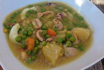 Cebolla.Ajo: 1 diente.Chipirones: 250 gramos.Zanahoria: 1.Guisantes: 100 gramos.Patatas: 400 gramos.Azafrán.Sal. Vino blanco: 100 mililitros.Huevo cocido: 2.Laurel: 1 hoja.Perejil.Aceite de oliva virgen extra.