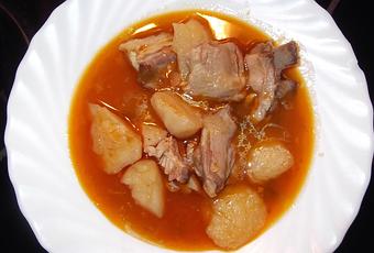 Ahora sólo queda cubrir las patatas y la carne con el agua y salar el caldo. Lo dejamos cociendo a fuego medio durante 45 minutos o hasta que veamos que la patata está blanda. Si el caldo nos ha quedado demasiado aguado podemos sacar varios trozos de patata con un poco de caldo a un plato y machacarlo para darle espesor. Cuando la patata esté blanda ya está listo para comer.