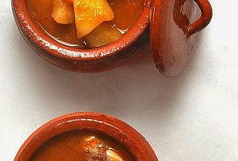 - En una cacerola ponemos un poco de aceite y freímos las costillas, cuando estén un poco doradas añadimos las patatas "chascadas" y damos unas vueltas, añadimos el puré del sofrito, removemos bien y añadimos agua hasta cubrir.