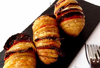 Pues ya has visto que estas patatas tan ricas y resultonas se hacen en un santiamén. Tan sólo te debes percatar de cortar las patatas adecuadamente. Como he dicho, se trata de cortarlas en láminas finas, pero sin llegar al final, manteniendo la patata entera. Para ello hay dos trucos principalmente: