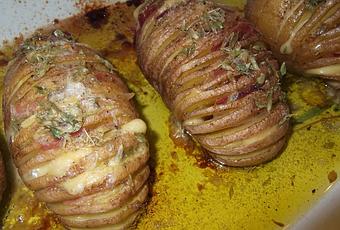Elaboración:Lo primero que hacemos es lavar y secar bien las patatas. Comenzamos a laminar las patatas sin llegar a atravesar toda la patata. Hacemos láminas de unos 4 milímetros a lo ancho. Una vez que tenéis laminadas las patatas comenzamos a realizar el majado con el ajo en polvo, la sal, la pimienta, el orégano y un buen chorro de aceite de oliva.